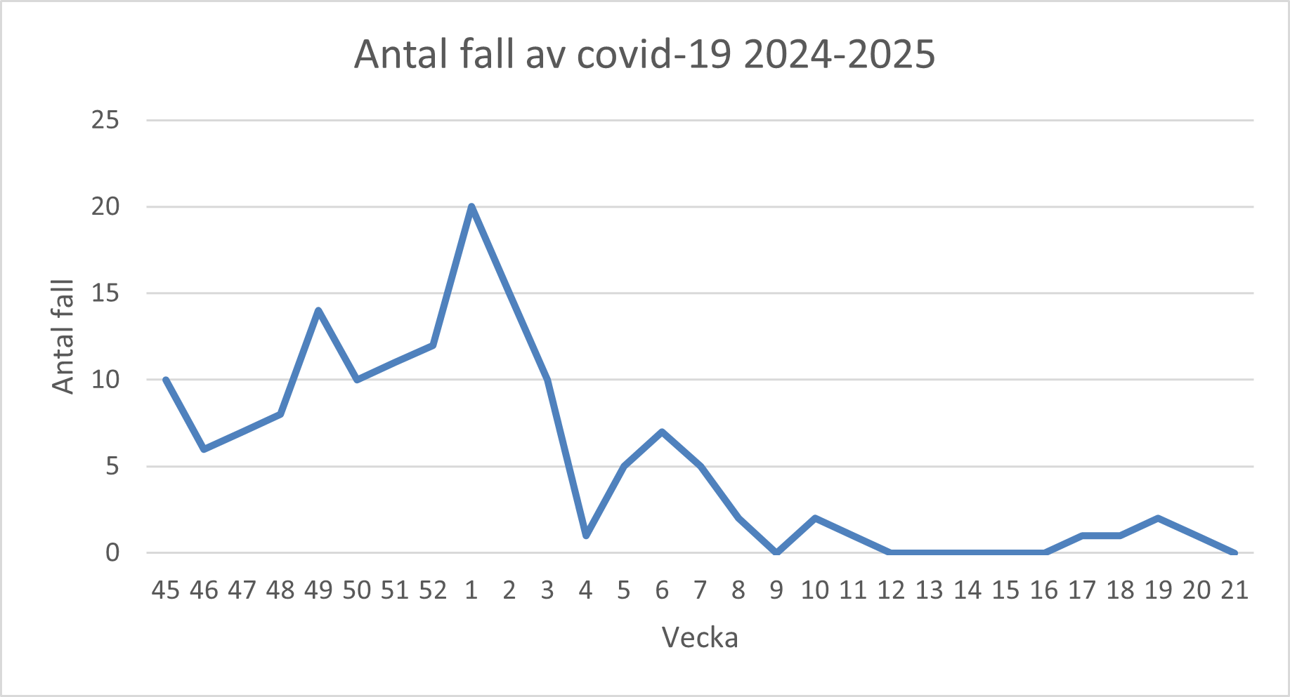 Diagrammet visar antal fall av covid-19 från vecka 45 2024 till vecka 21 2025. Under årets första veckor har vi sett en ordentlig minsking av antalet fall, vecka 4-6 såg vi en liten ökning men fortsatt på en låg nivå, från vecka 7 har antalet fall minskat igen, sedan inga fall under några veckor så även v. 21.