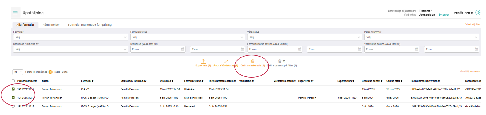 Exempel skärmklipp - 2 formulär markerade för gallringFörstora bilden